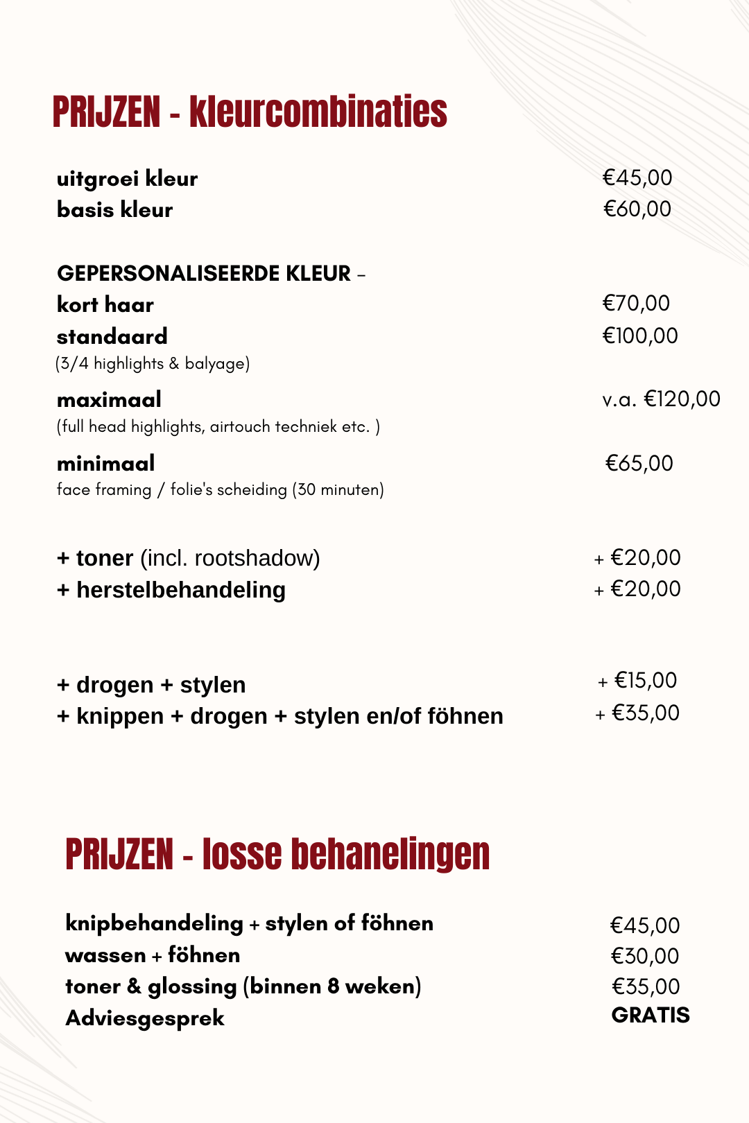 Wanneer je bij mij komt om te kleuren, kiezen we altijd een combinatie. Daarin heb je de keuze welke kleurbehandeling jij wilt, welke extra’s er nodig zijn voor je haar en of je de behandeling wilt afsluiten met of zonder knippen.